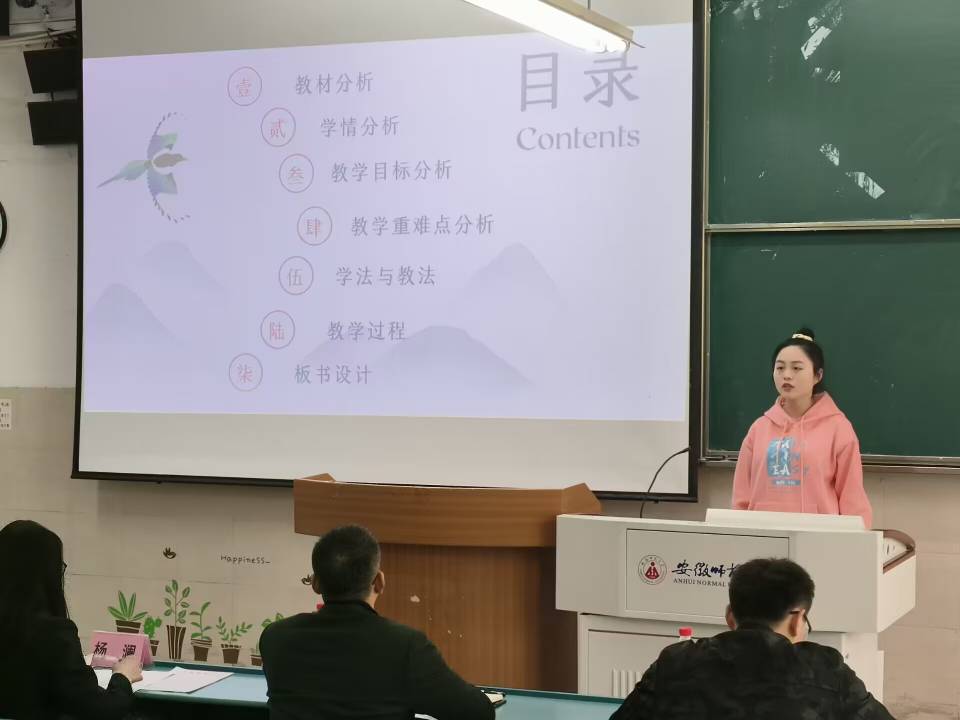 大赛以说课形式开展,重点考察学生的教法运用、学法指导、课标理解、教材分析、教学内容和板书设计。比赛开始前,参赛选手通过线上抽签的方式决定出场顺序,因实习等原因未能到场选手以录制视频形式参赛,时长限制为10分钟。整场比赛,选手们讲解流畅,板书优美,仪态端庄大方,充分展现了师范生的教学技能和个人风采。经过激烈角逐,比赛评出一等奖1名,二等奖2名,三等奖3名和优秀奖4名。