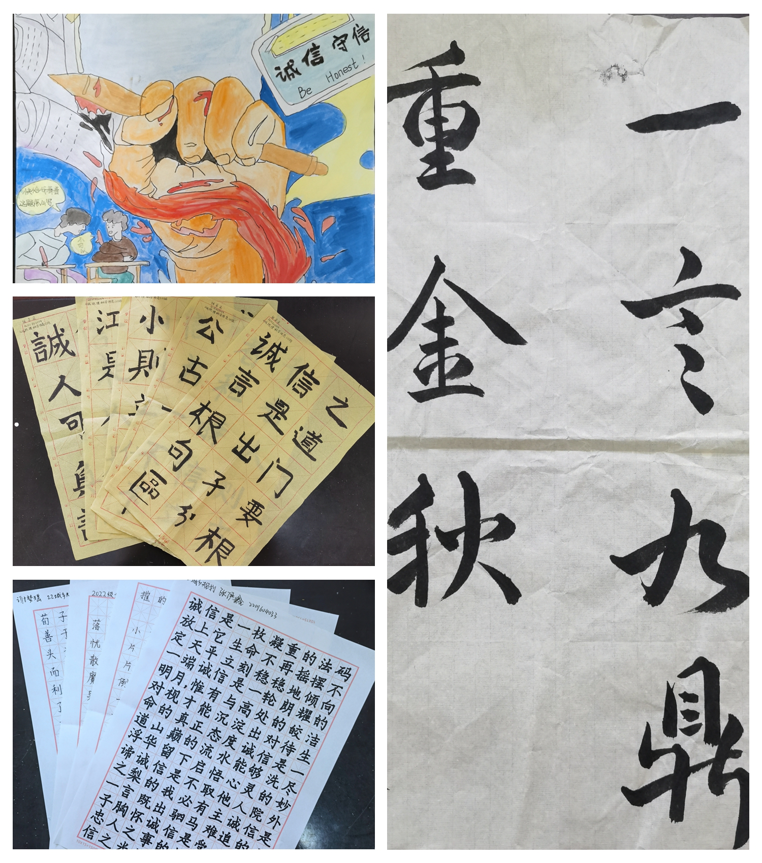 征集诚信主题作品,丰富形式载体。为引导学生践行“讲仁爱、重民本、守诚信”的价值理念,通过征集文稿、书法、绘画、剪纸等诚信主题作品丰富宣传教育方式,引导学生在实践中感悟诚信的重要性,让诚信的观念深深融入每位学生的心里,真正做到内化于心、外化于行。