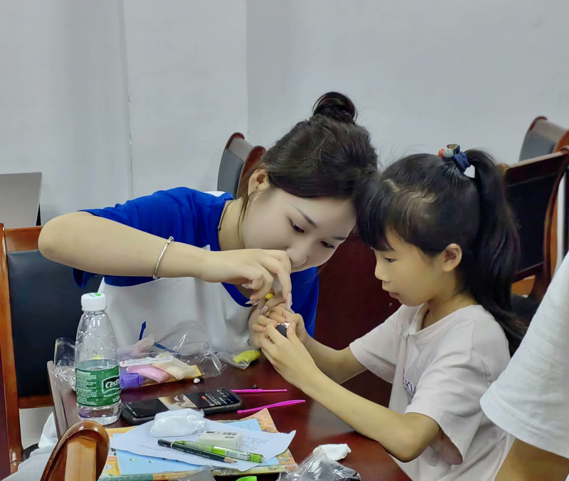 课程过后,进入“手工黏土”的手工创作环节。队员们给小朋友分发黏土、工具、模型等,让小朋友们在动手中培养实践能力,充分发挥自身的想象力与创造力将脑中的世界通过双手转化为实物,创作出“超级棒棒糖”“花朵”等一系列各具特色的手工作品。
