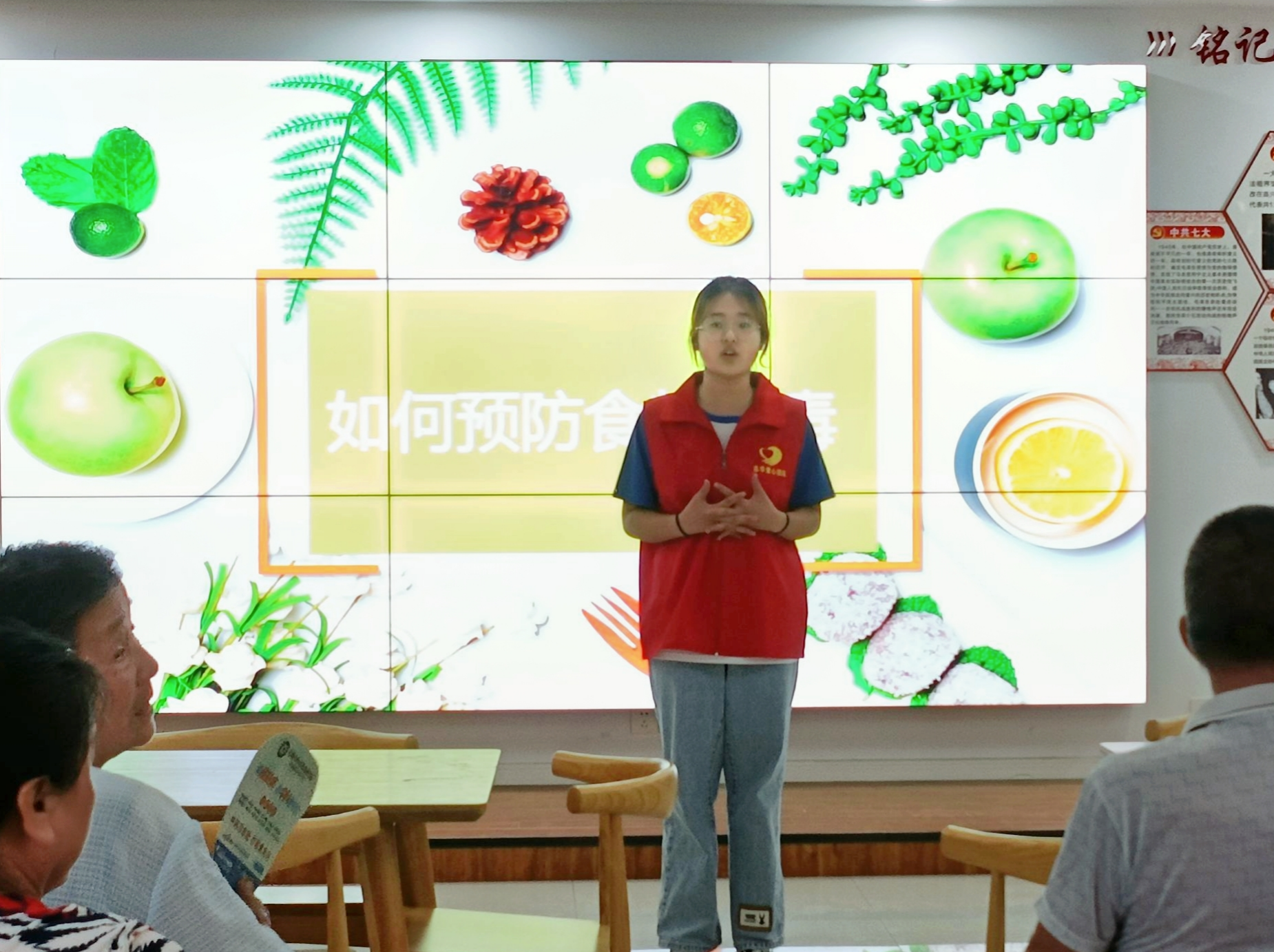 下午由队员钱睿涵主持开展以预防食物中毒为主题的科普宣传讲座,强调预防食物中毒的重要性,列举了多种发生在身边真实的例子,不断地强化老人们自我防范的意识。
