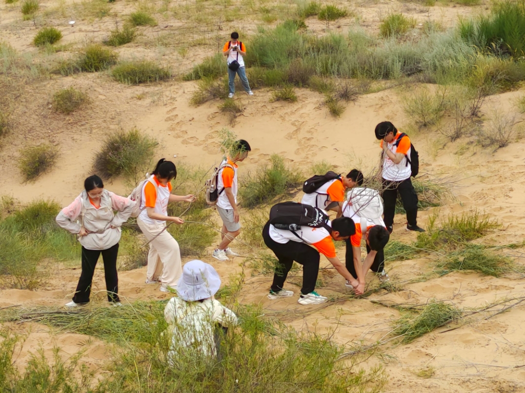 团队成员结合问卷调查、实地走访等方式亲身体会治沙过程,思考治沙内涵,传承治沙精神,并结合遥感技术、无人机技术和地面观测等多种方法定量评价,为当地沙漠化防治工作注入青春力量。