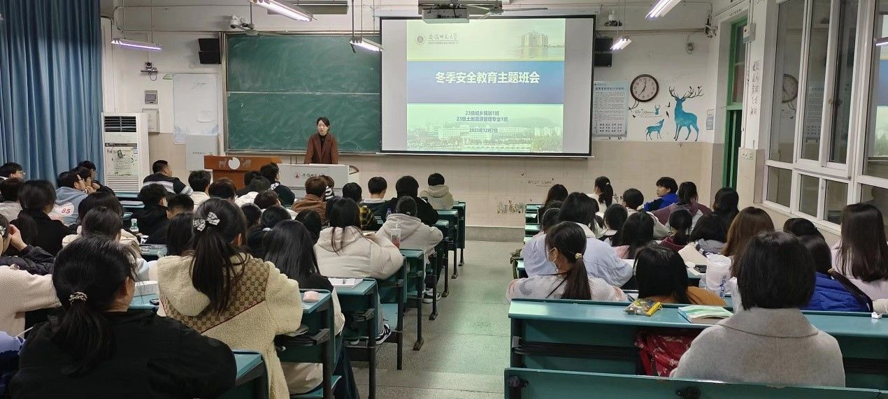 大学生护航行动的落实,提升同学们的冬季安全防范意识,有效防范安全事故发生,保障同学们在校的健康成长。2023级本科生兼职辅导员李婷君老师于2023年12月7日晚在安徽师范大学花津校区4号楼202教室召开本科生冬季安全教育主题班会,2023级土地资源管理1班、2023级城乡规划1班全体同学到场参加。