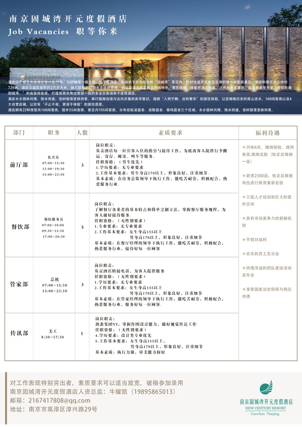 南京固城湾开元度假酒店招聘简章
